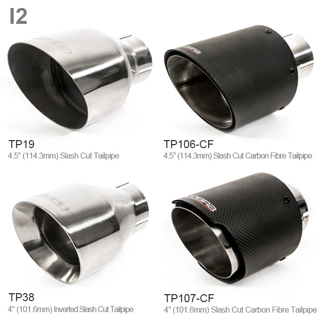 This exhaust has a choice of 4″ (101.6mm) tailpipe options including a choice of carbon fibre tip options.