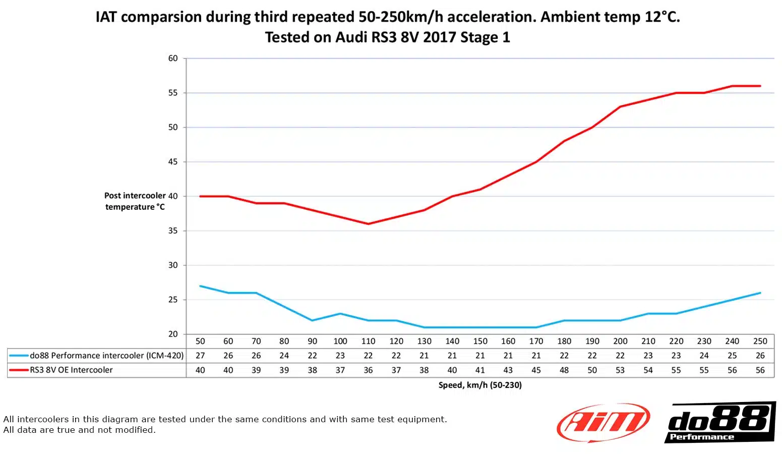 During our tough cooling efficiency tests on closed air strip we not only saw a huge reduction in intake air temperature but the Dragy we had in the car showed a consequent reduction in 100-200km/h acceleration time by a half second with our intercooler in place!