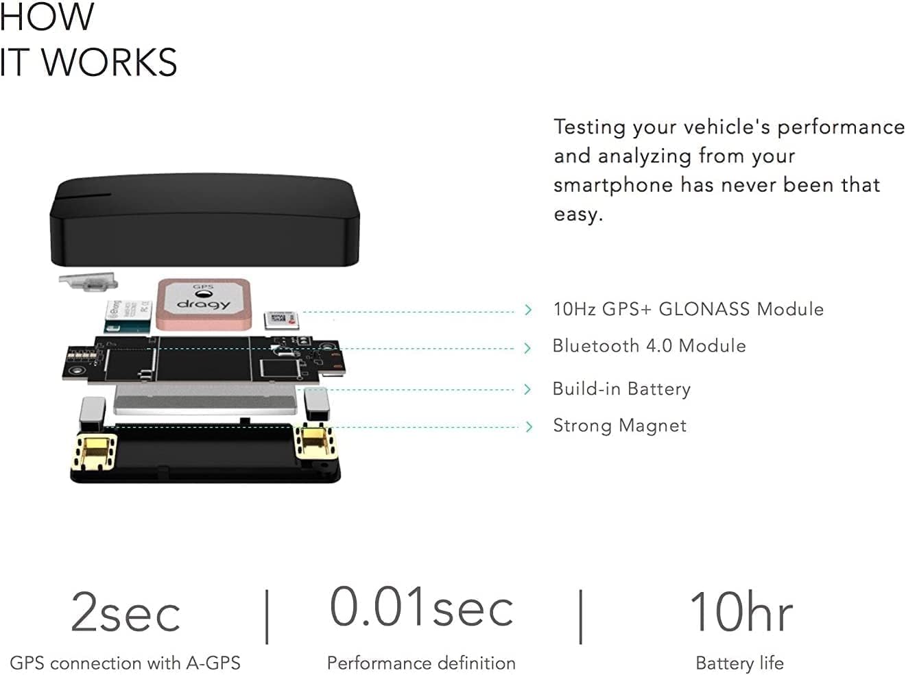 - Feature-Rich App Integration – Use your smartphone (iOS 8.0+ or Android 4.4+) via Bluetooth 4.0 to track, overlay data on video, compare runs, join leaderboards, and analyze braking, G-force and more – all within the Dragy app ecosystem.
