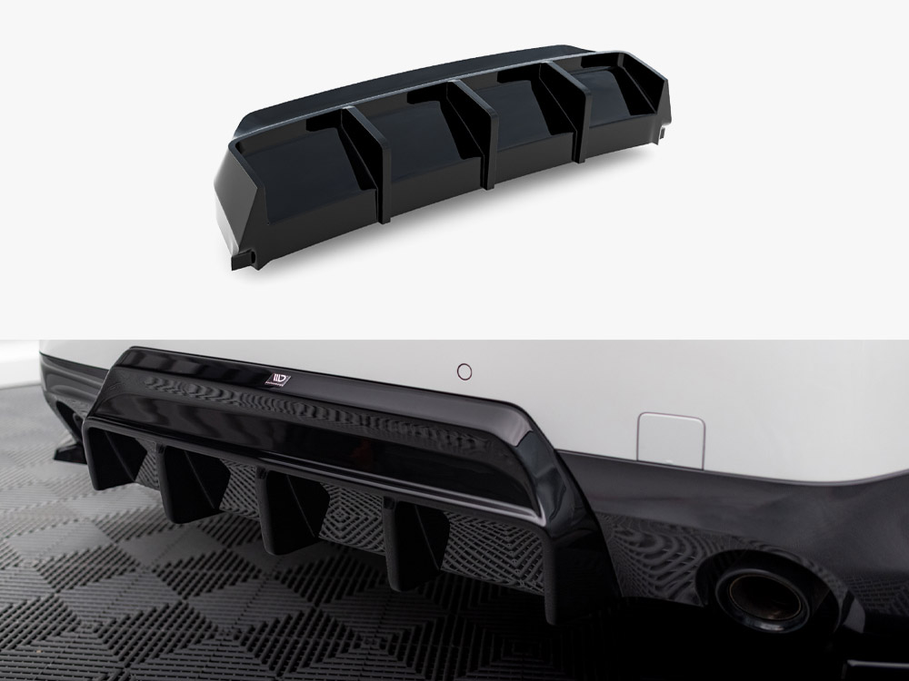 A complete rear valance in gloss black, engineered to replace the original diffuser for a seamless fit.