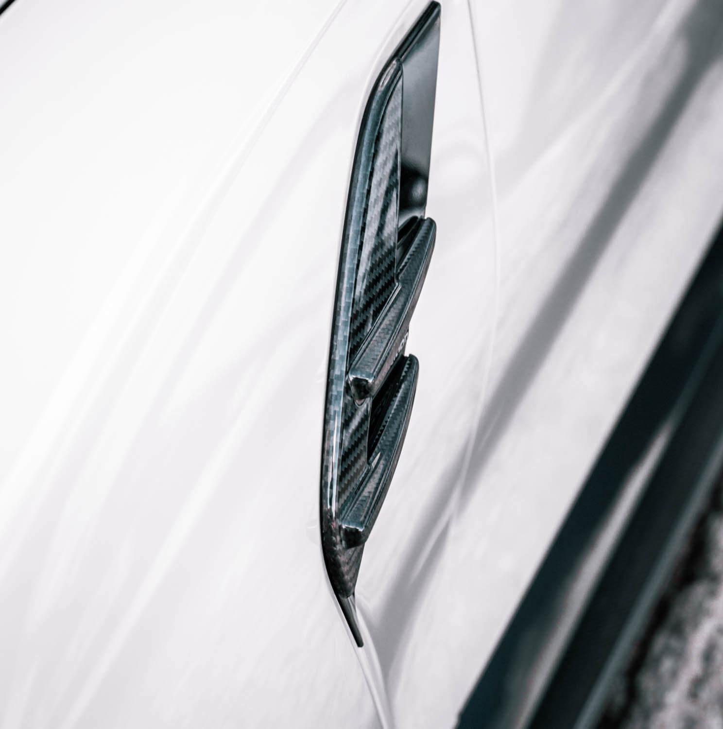 - Pair of MHC+ side fender badge covers in gloss pre-preg carbon fibre
