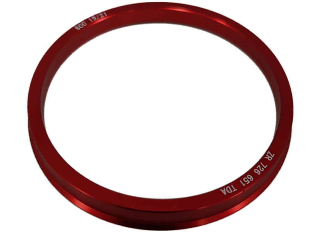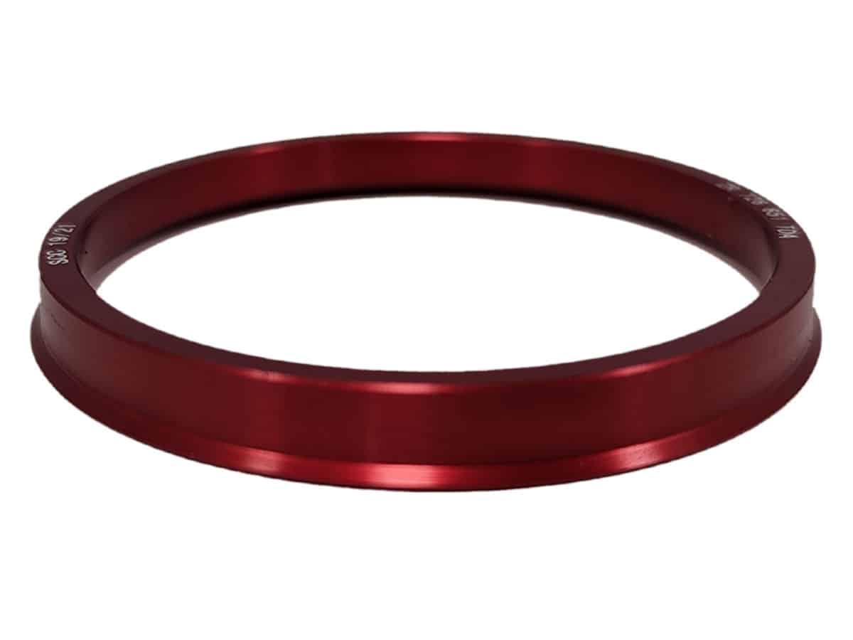 Red anodised aluminium spigot rings in various sizes.