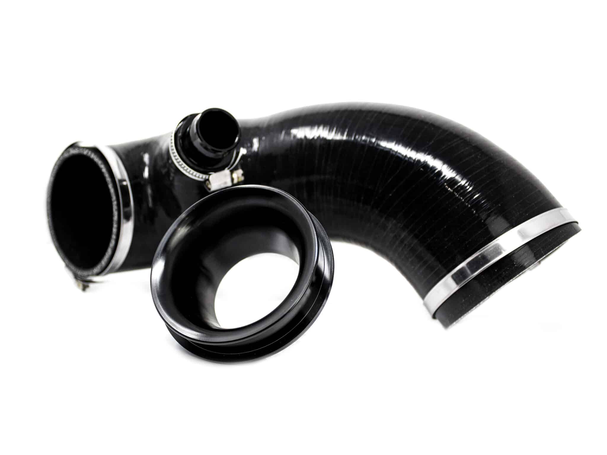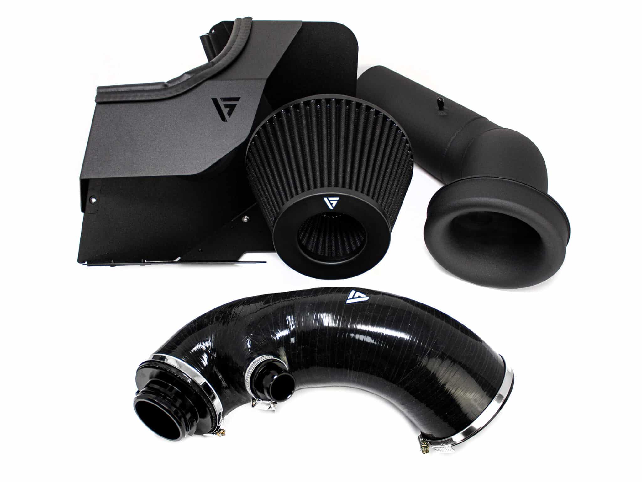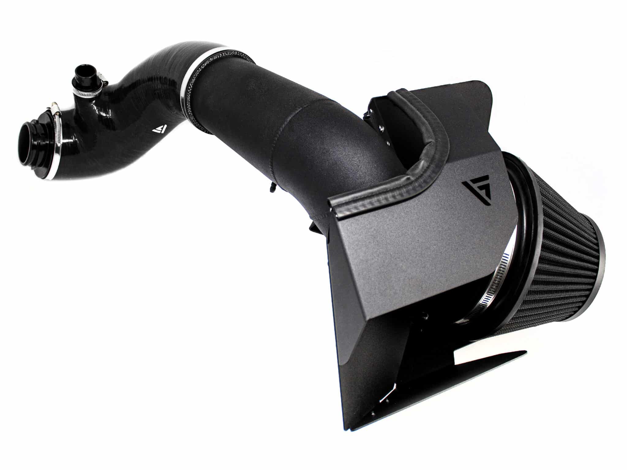 A highly efficient duel cone pleated cotton filter features over 1.375m of filtration area. Air leaves the filter through a 150mm exit including a velocity stack which unifies the airflow smoothly into the oversize 102mm intake piping. The final velocity stack is specifically port matched to the OEM turbo inlets, providing improved inlet geometry. This setup has been proven to flow more air with less turbulence and can offer huge performance gains while putting less stress on turbo components, a fantastic solution for stock and stage-tuned vehicles alike.